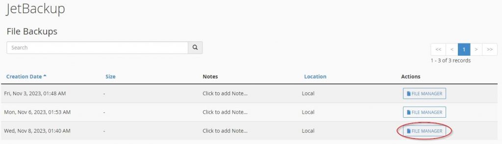 Tryk på FILE MANAGER ud for den dato du vil gendanne dine filer fra.
