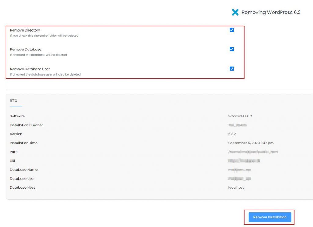 6. Tryk på Remove Installation. Nu afinstalleres sitet.