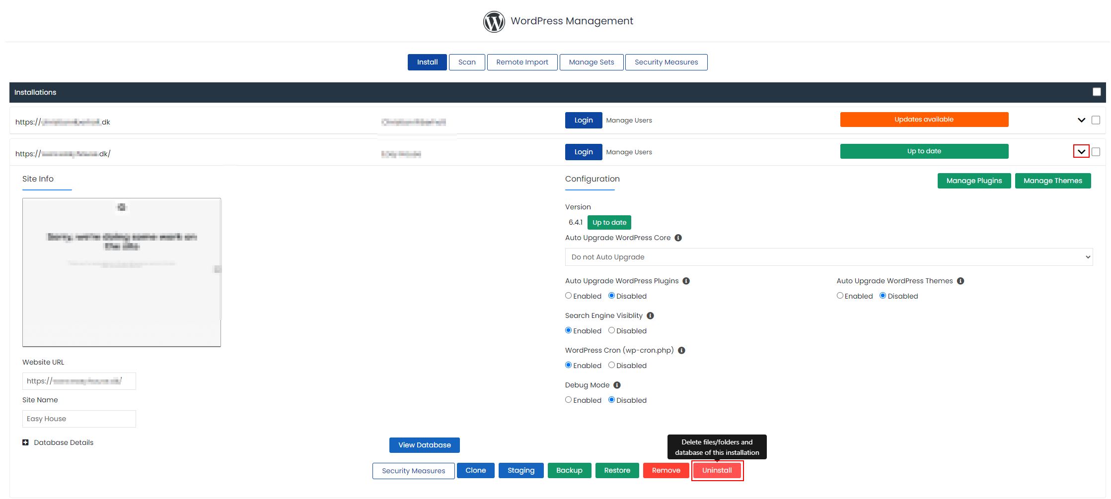 5. Udvid det site du vil afinstallere ved at trykke på pilen og derefter tryk på Uninstall. Sæt flueben i Remove Directory + Remove Database + Remove Database User hvis du ønsker at afinstallere alt. Ellers undlad et flueben i det felt du ikke ønsker skal slettes.