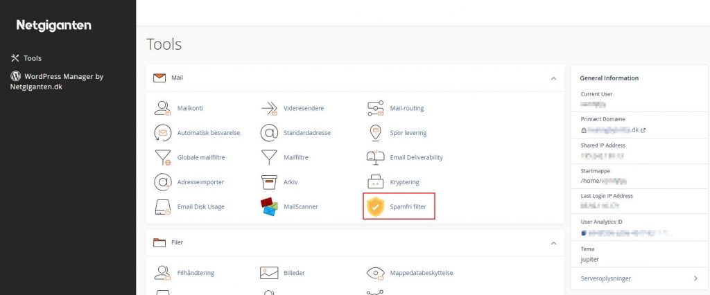 Når du er i cPanel, skal du trykke på Spamfri Filter som ligger under Mail.